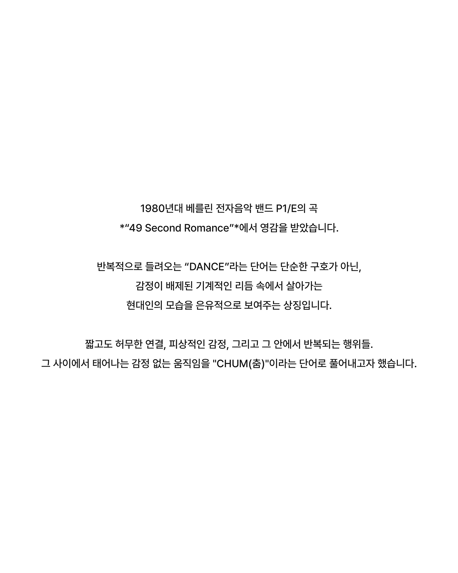 그 사이에서 태어나는 감정 없는 움직임을 "CHUM(춤)"이라는 단어로 풀어내고자 했습니다.
