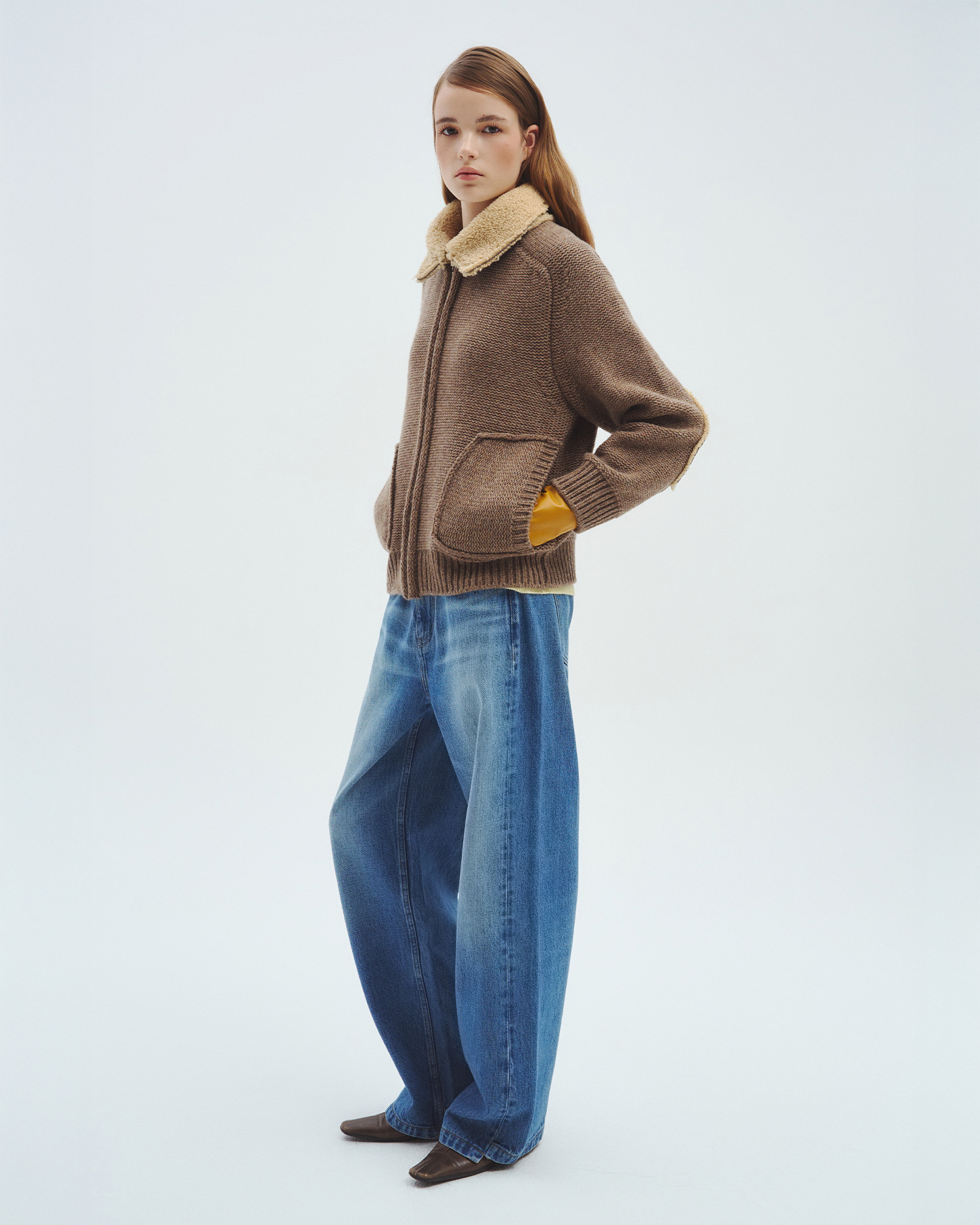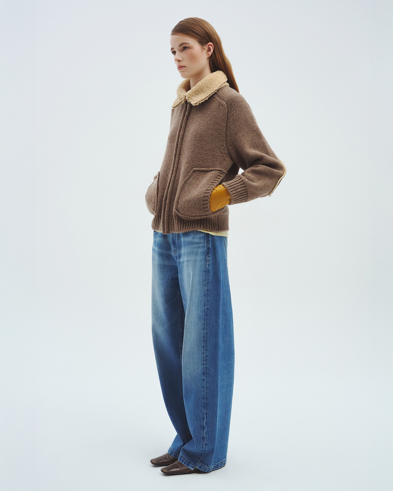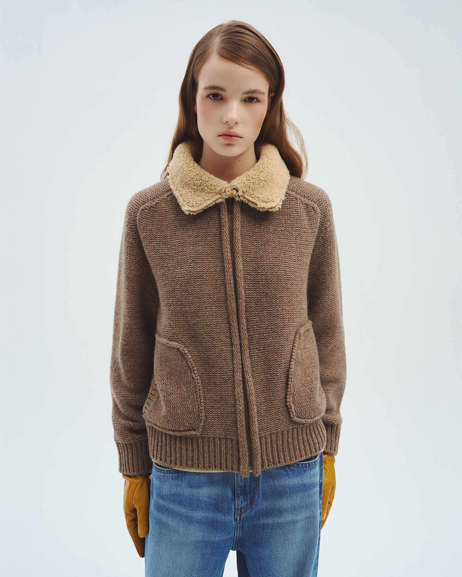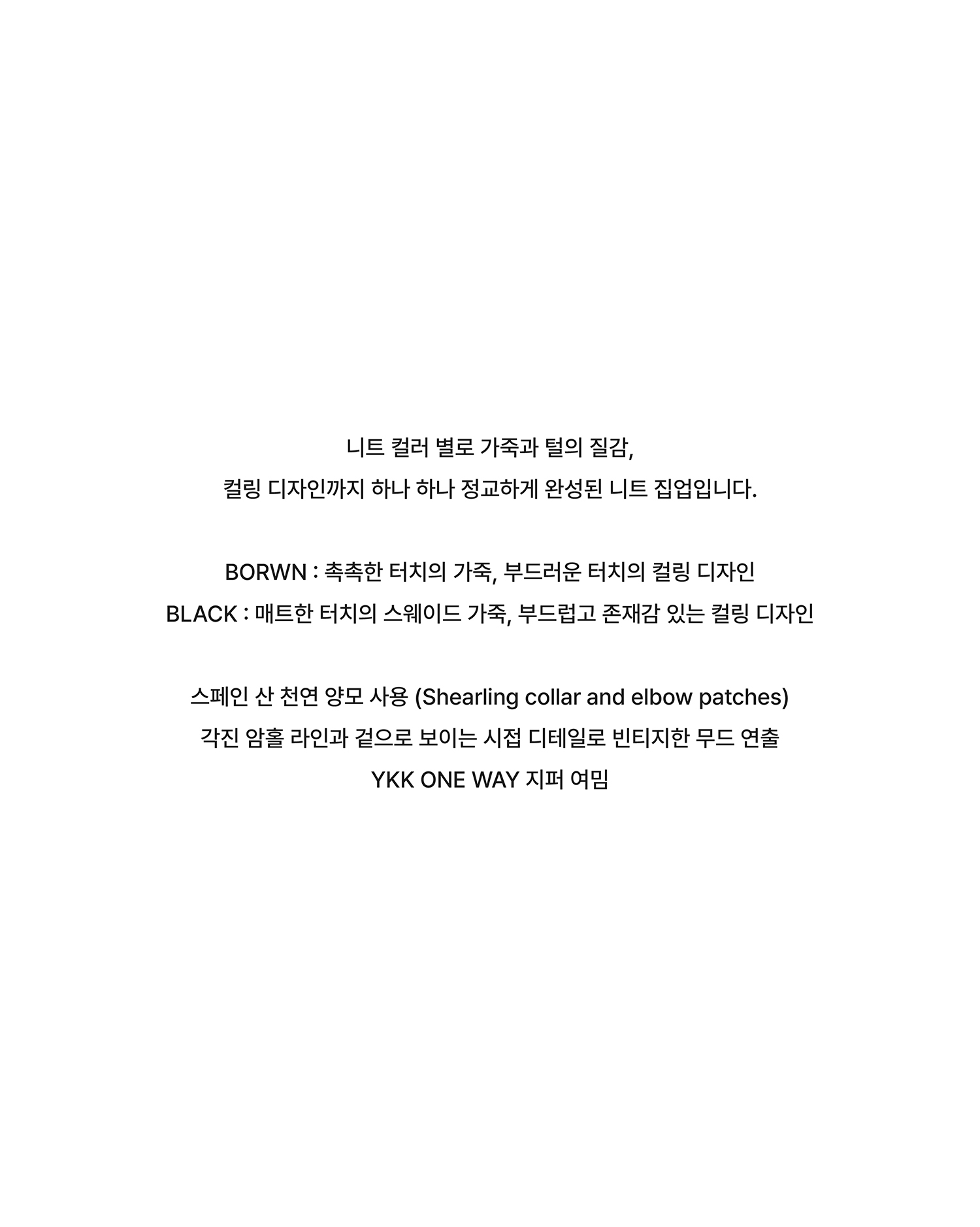 니트 컬러 별로 가죽과 털의 질감, 컬링 디자인까지 하나 하나 정교하게 완성된 니트 집업입니다.