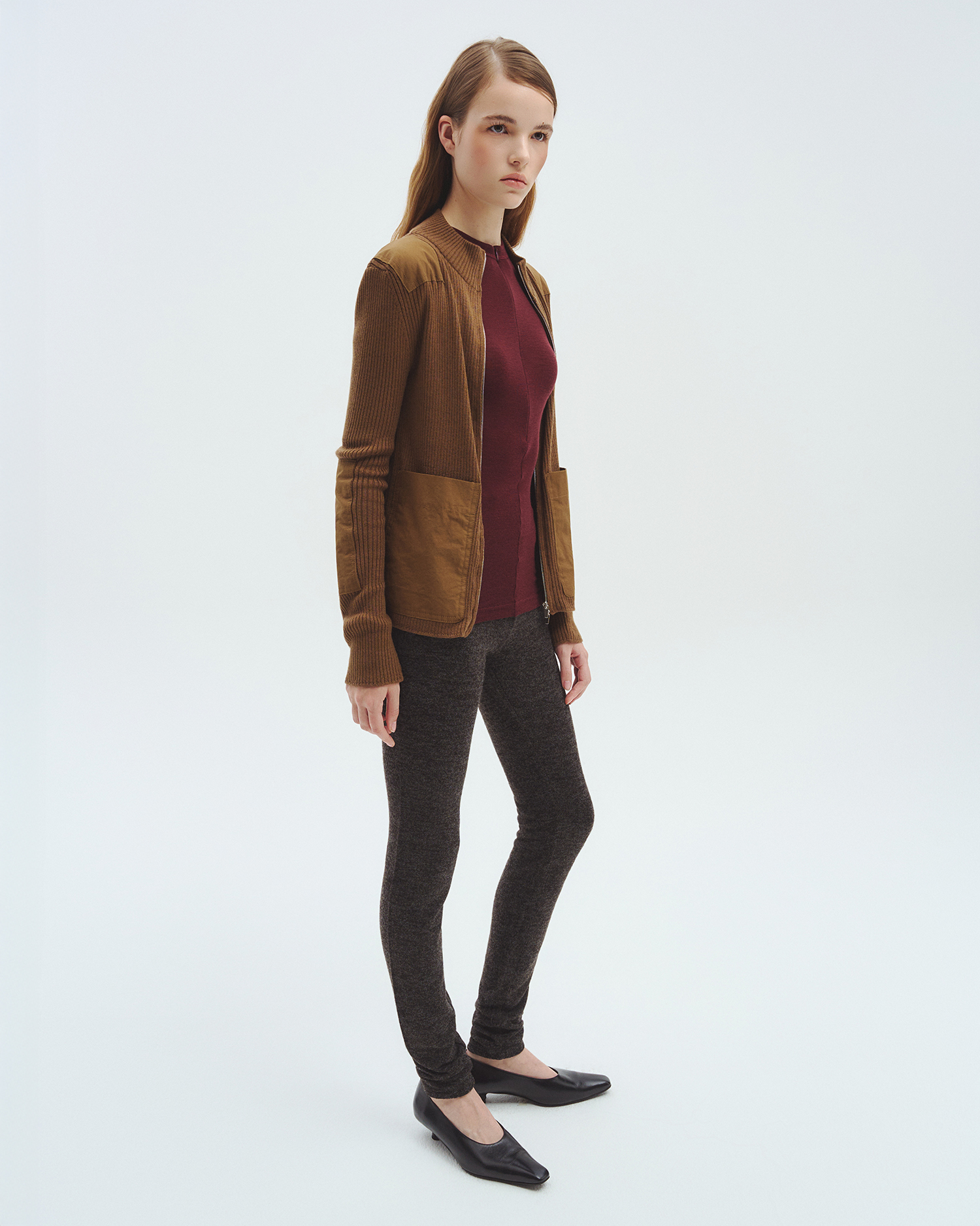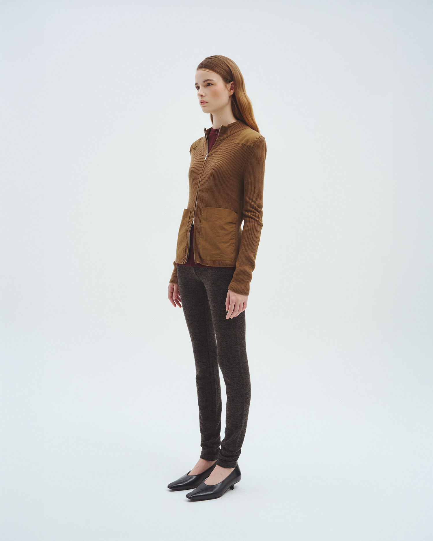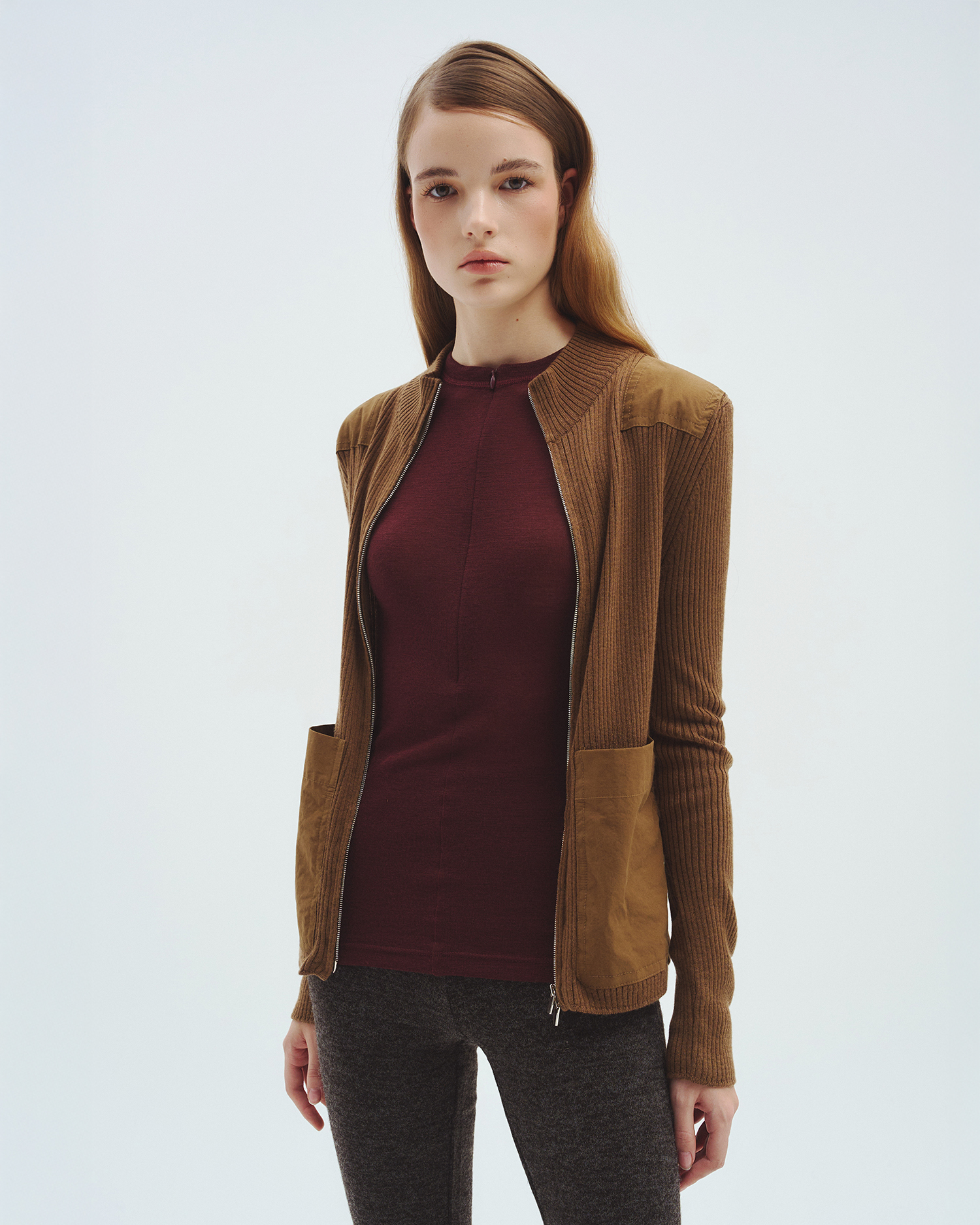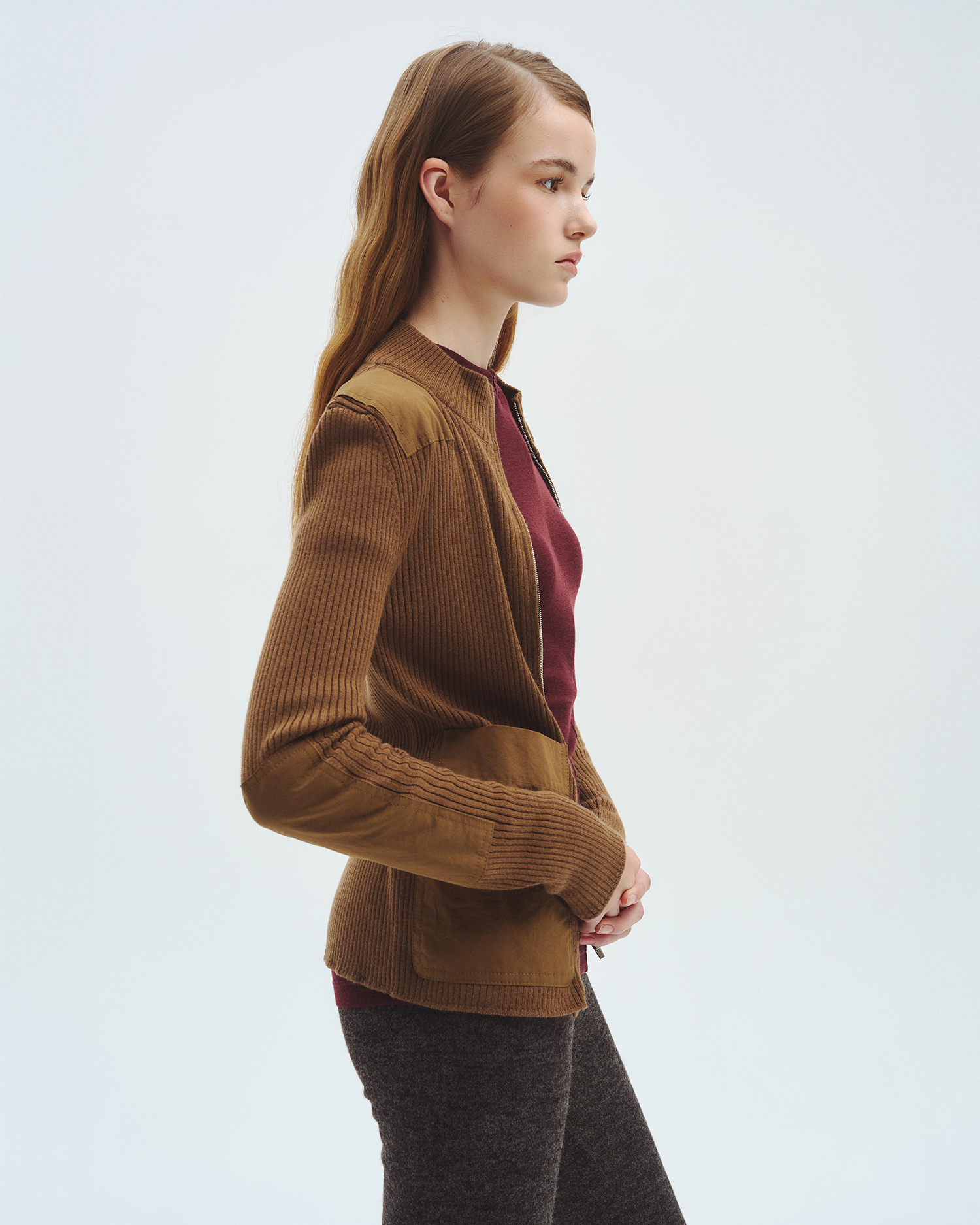 니트와 톤온톤으로 매칭한 우븐 패치 디테일