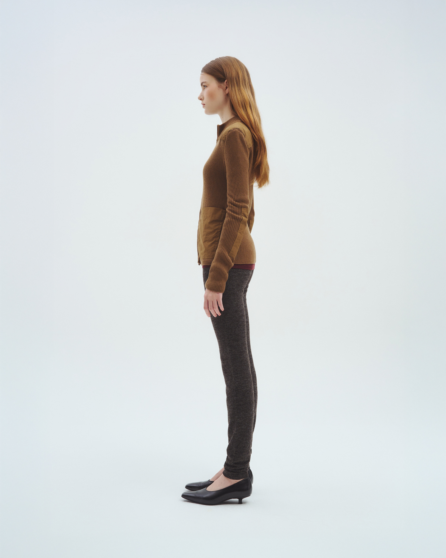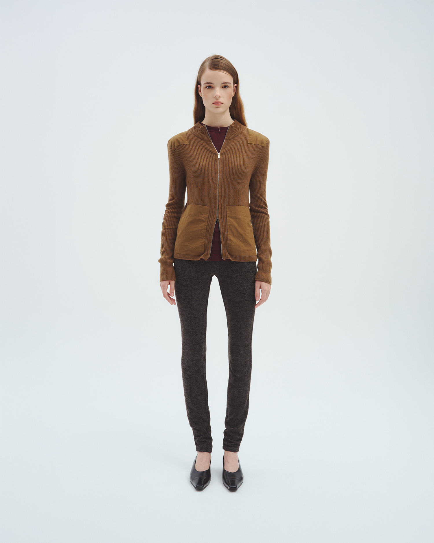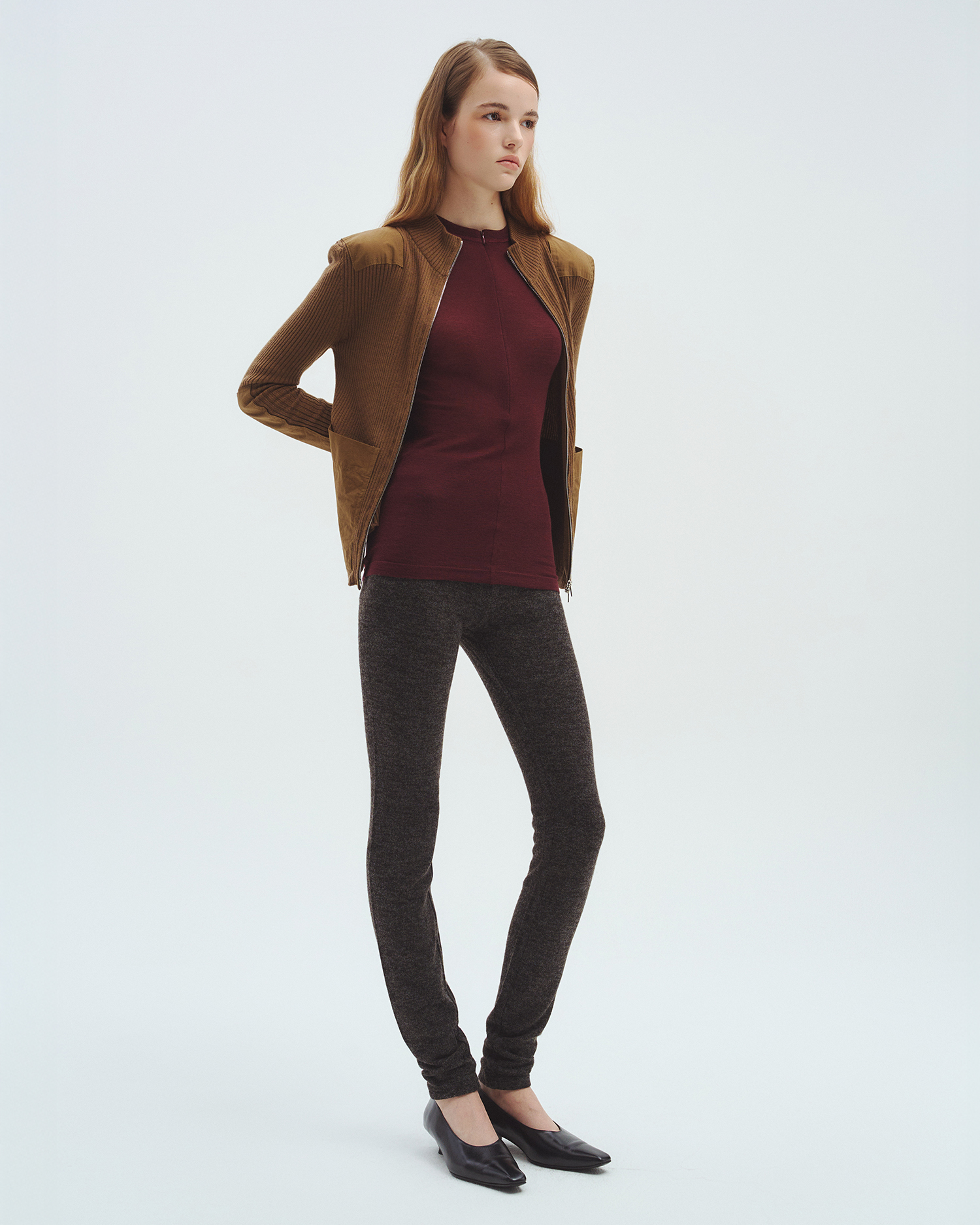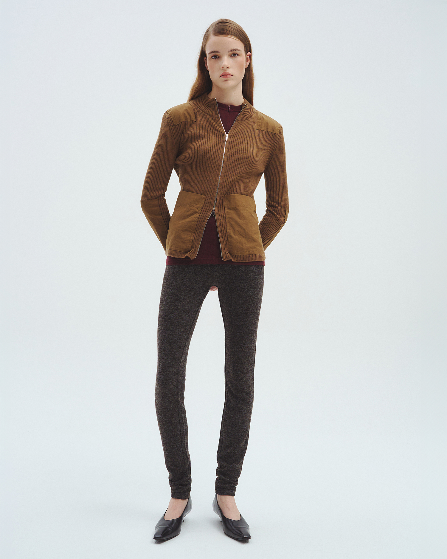 니트와 톤온톤으로 매칭한 우븐 패치 디테일